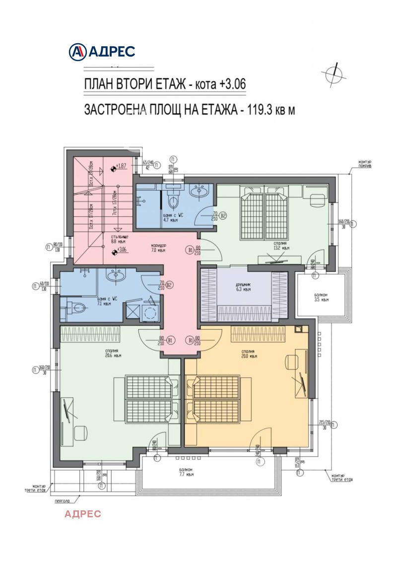 АДРЕС предлага на вашето внимание прекрасна триетажна къща, която е част от затворен комплекс в местност Горна Трака, състоящ се от шест двуетажни и десет триетажни къщи, разположени в богато озеленен парцел в тих и спокоен район.