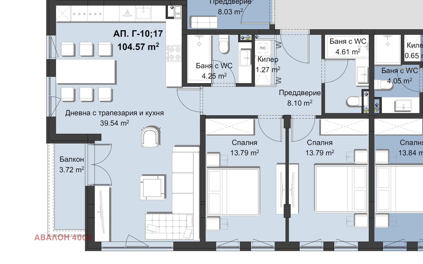 Голям тристаен апартамент с много добро разпределение, разположение и осветеност на правилни помещения - хол с кухня 39 кв.м., две спални, две големи баня с тоалетна, удобно входно антре с място за гардеробна и една тераса. Този апартамент, предвид голямата дневна зона може да бъде трансформиран в такъв с три спални. Топъл и светъл с големи прозорци и 25см., вътрешни преградни стени със съседите, АЛУМИНИЕВА дограма. Ще бъде завъшен на шпакловка и замазка, с изолация и подготовка за подово отопление, ел. инсталация с ключове и контакти, ВиК на тапа, Входна блиндирана (и пожароустойчива) врата, домофонна система, декинг покритие на външните части. Общи части - завършени с гранит, мрамор, желязо и дърво.