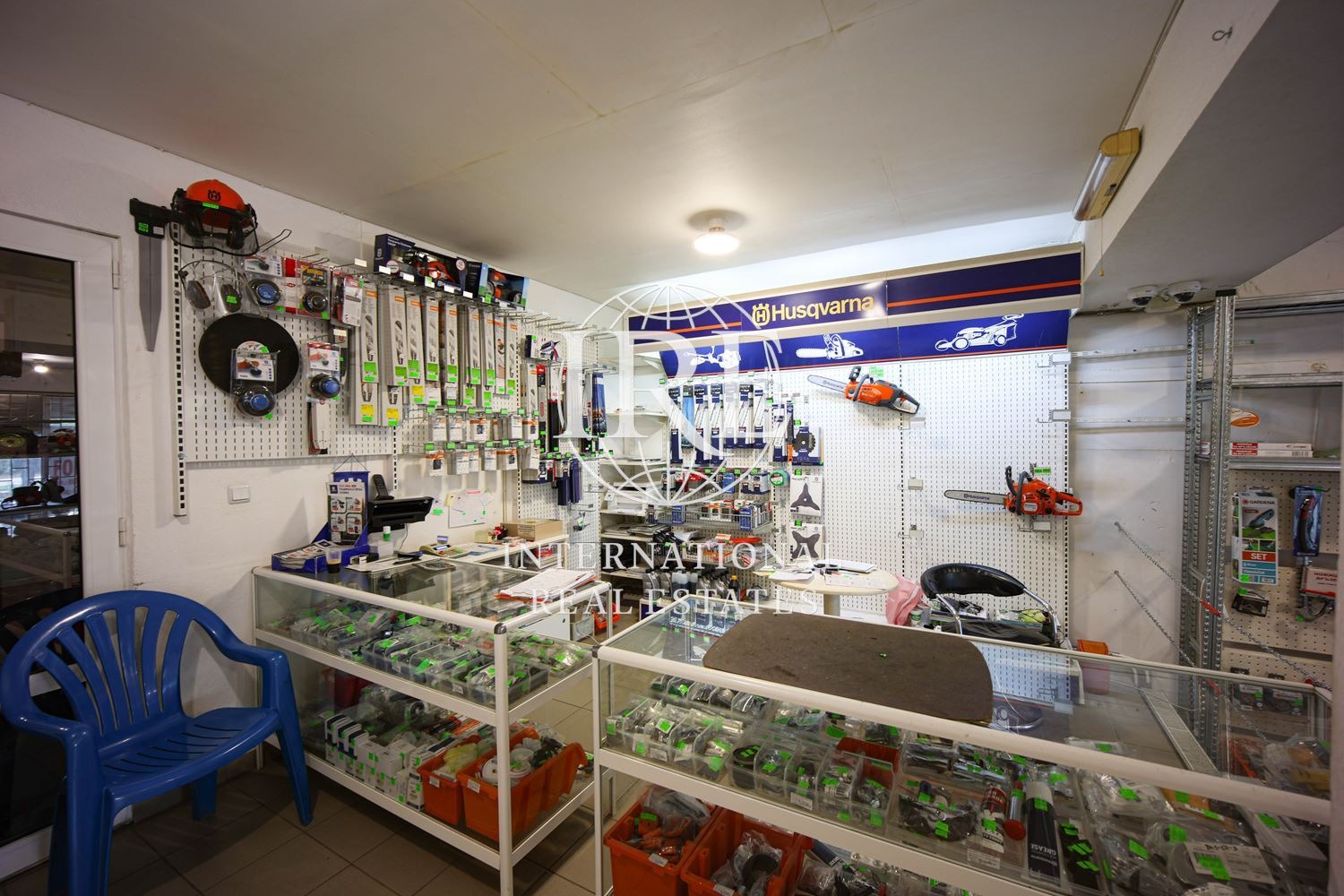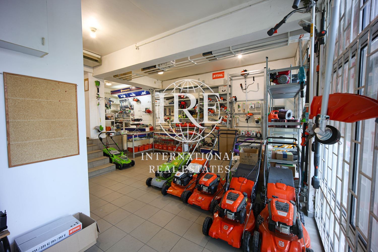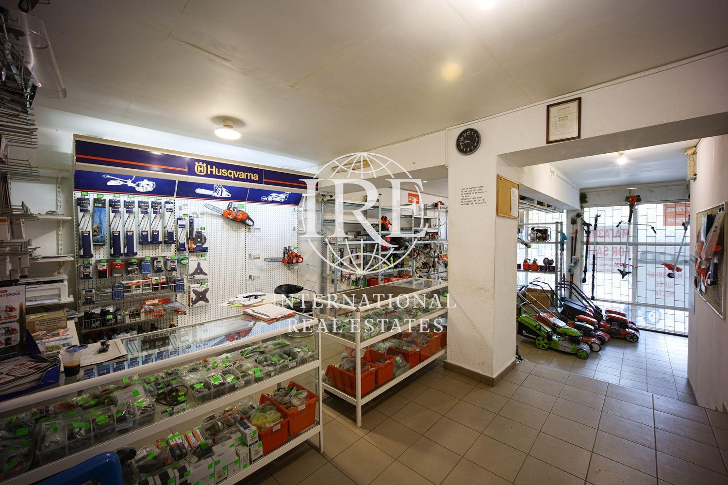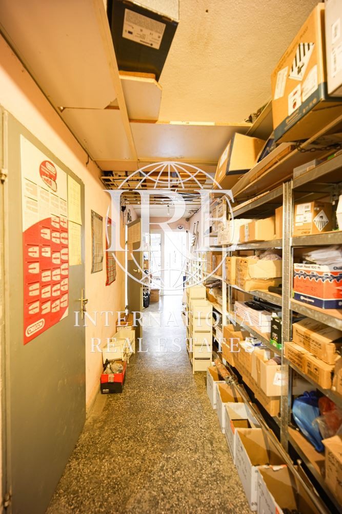 Обектът разполага с два входа/изхода: основен с големи витрини към улицата и втори служебен/товарен вход в задната част, обезопасен с желязна гаражна врата.