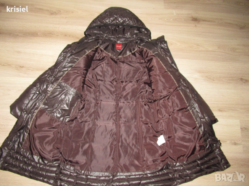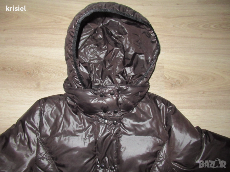 Якето е ново.Пухенка е.Номер М.Изцяло с пълнеж от гъши пух.Изключително топло яке.Страхотно красиво и елегантно.Вталена кройка.Шоколадов цвят.С подвижна качулка.Размерите са:дължина--89см,гръдна-50см,талия-46см,ханш-54см,ръкав-63/45см