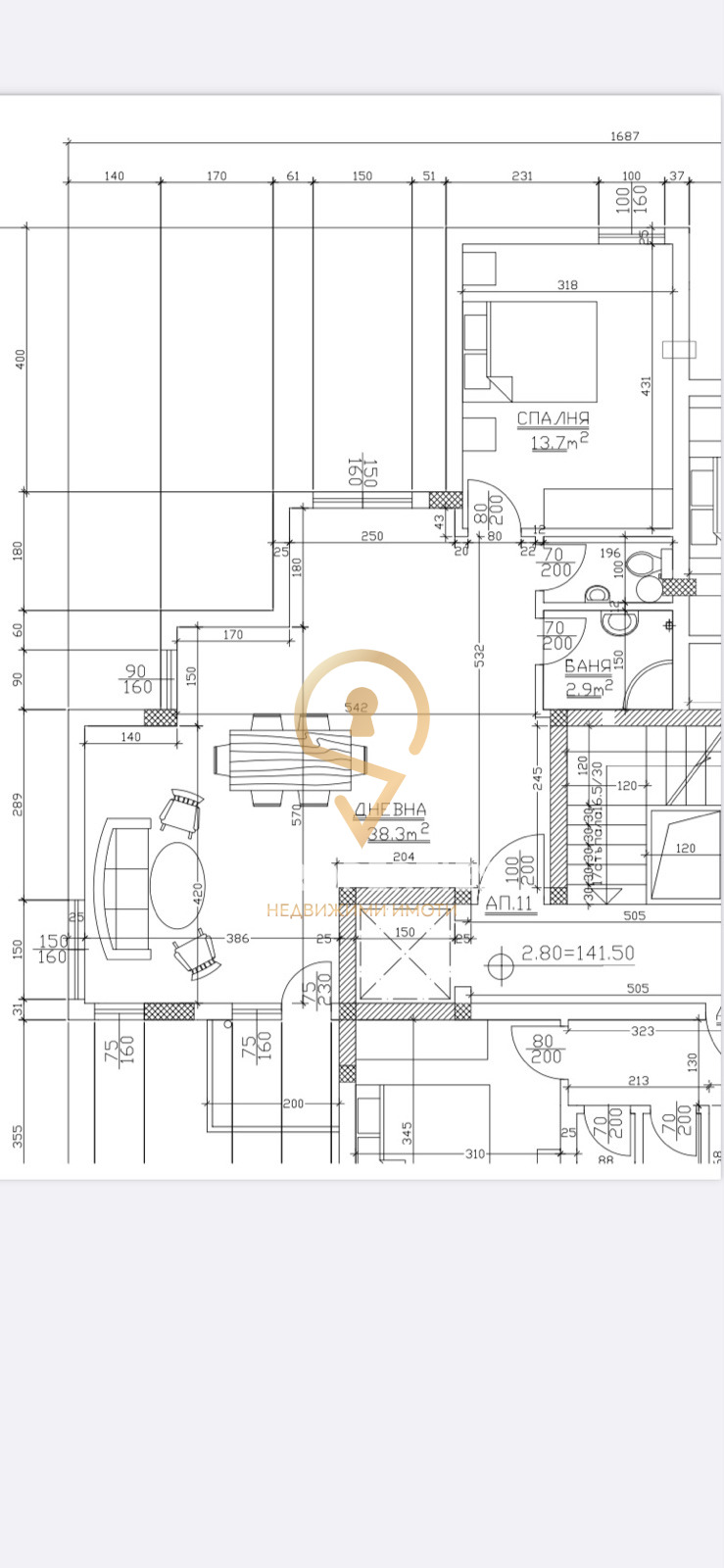 Просторна и светла дневна с кухненски бокс (38.3 кв.м), подходяща за обособяване на втора спалня с площ около 11 кв.м, основна спалня (13.7 кв.м), антре, тераса, баня и отделна тоалетна.