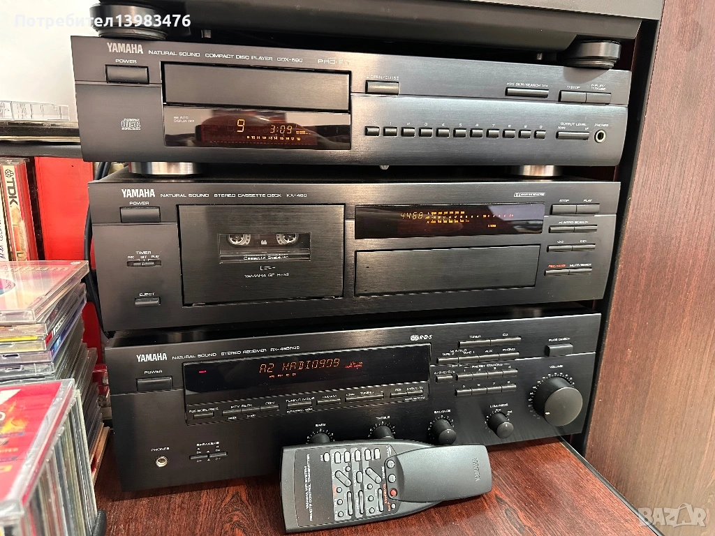 Сет на Yamaha състоящ се от ресийвър YAMAHA RX-495 RDS, касетен дек YAMAHA KX-480, CD плеър YAMAHA CDX-590 PRO BIT, дистанционно управление YAMAHA RAX 7, което управлява всичко.