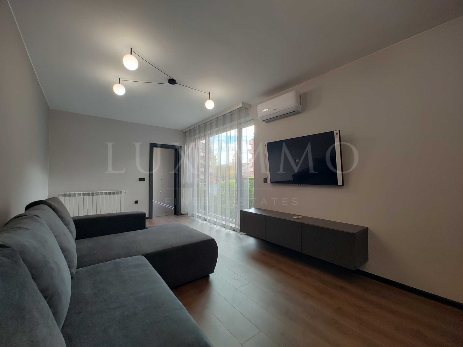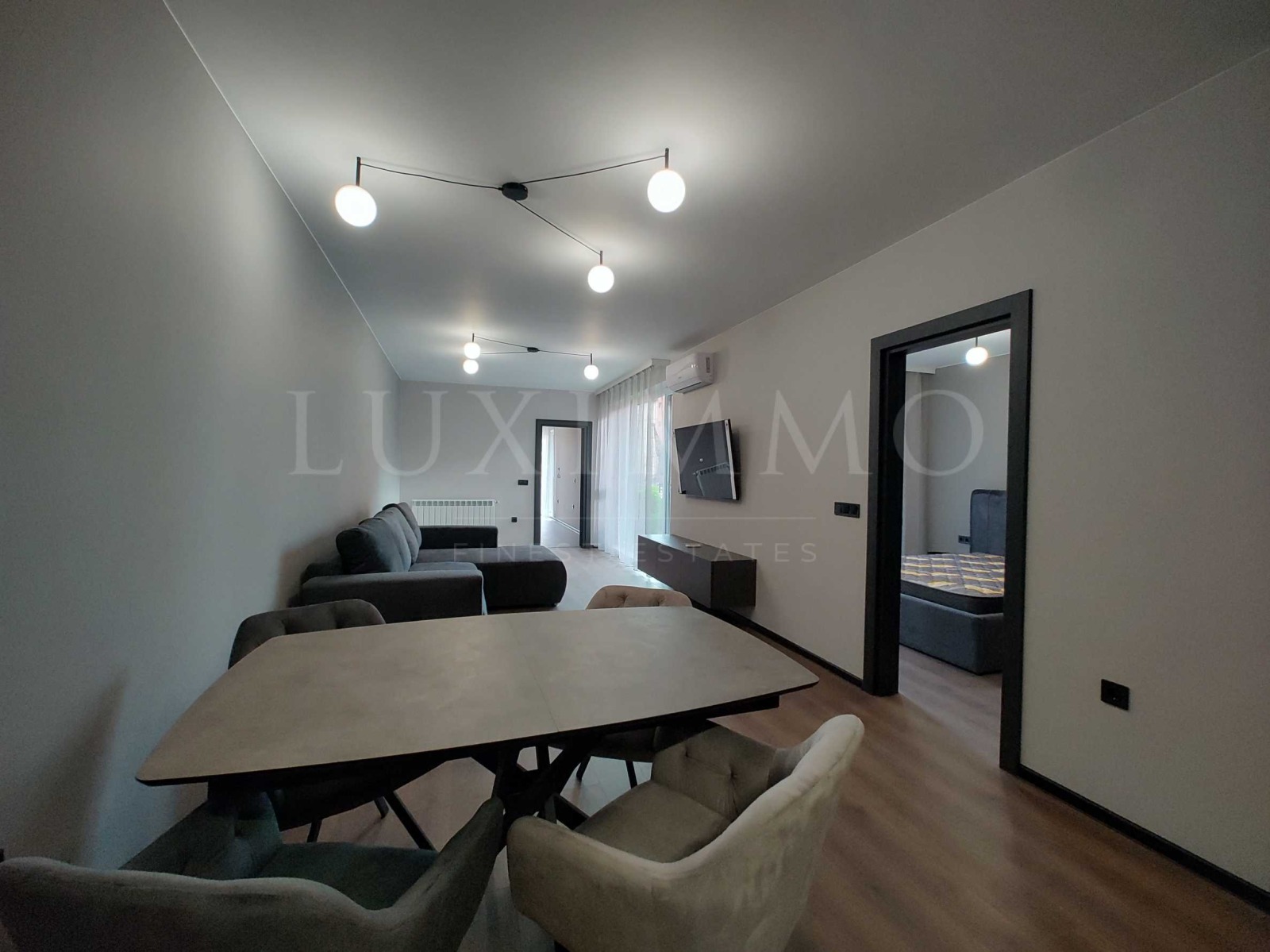 Апартаментът е чисто нов, луксозно обзаведен с висококачествени мебели и електроуреди от водещи марки. Интериорът е решен в съвременен стил, с внимание към детайла, създаващ усещане за комфорт и елегантност. Пространството е изключително светло и приветливо, благодарение на големите прозорци и южното изложение.