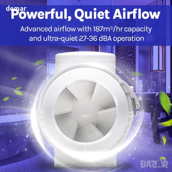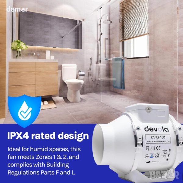 Мощен вентилатор за смесен поток за вграждане, осигуряващ въздушен поток от 187 м³/ч с ниско ниво на шум от само 27 dB. Изработен от издръжлив, труднозапалим полипропилен с подвижна централна секция за лесно почистване, той е съвместим със стандартни 100 мм въздуховоди и отговаря на IPX4 и части F и L от строителните разпоредби. Компактен и практичен по размер, той осигурява ефективна вентилация, като същевременно поддържа тиха среда без мухъл. Проектиран с висококачествен немски мотор и изработен във Великобритания за дълготрайна надеждност.
