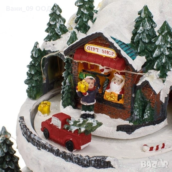 Коледна сценка, изработена от полирезин и ръчно рисувана, на две нива – горе заснежен пейзаж с магазинче за подаръци, фигурки и въртяща се кола, а долу – кафе шатра, фигурки и въртяща се пързалка. Работи с 3 батерии тип АА (не са включени) или с USB кабел (включен, 1 m). Може да избирате само осветление или осветление с музика.