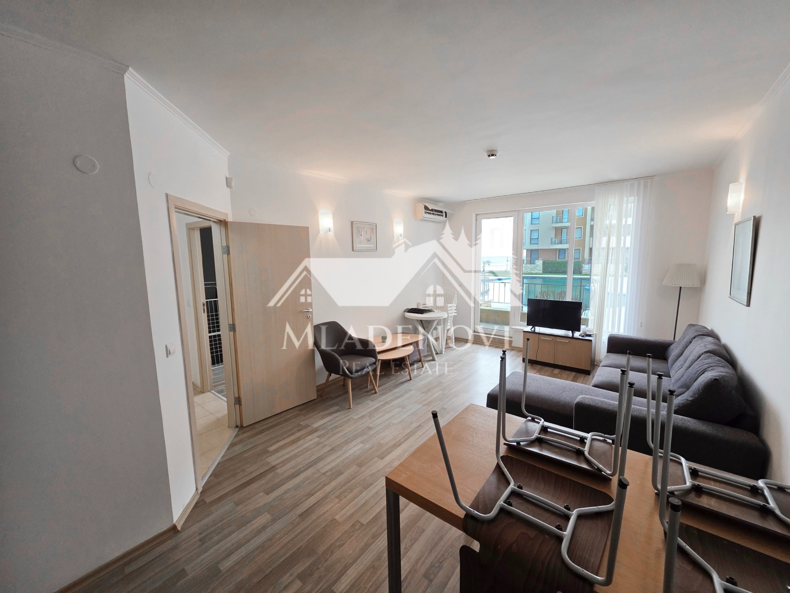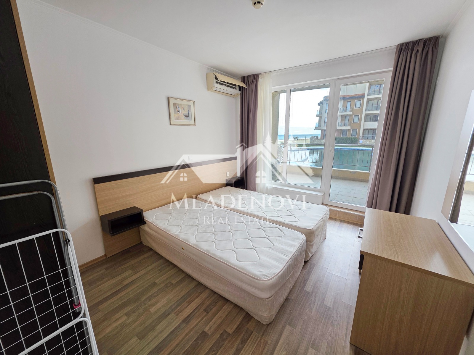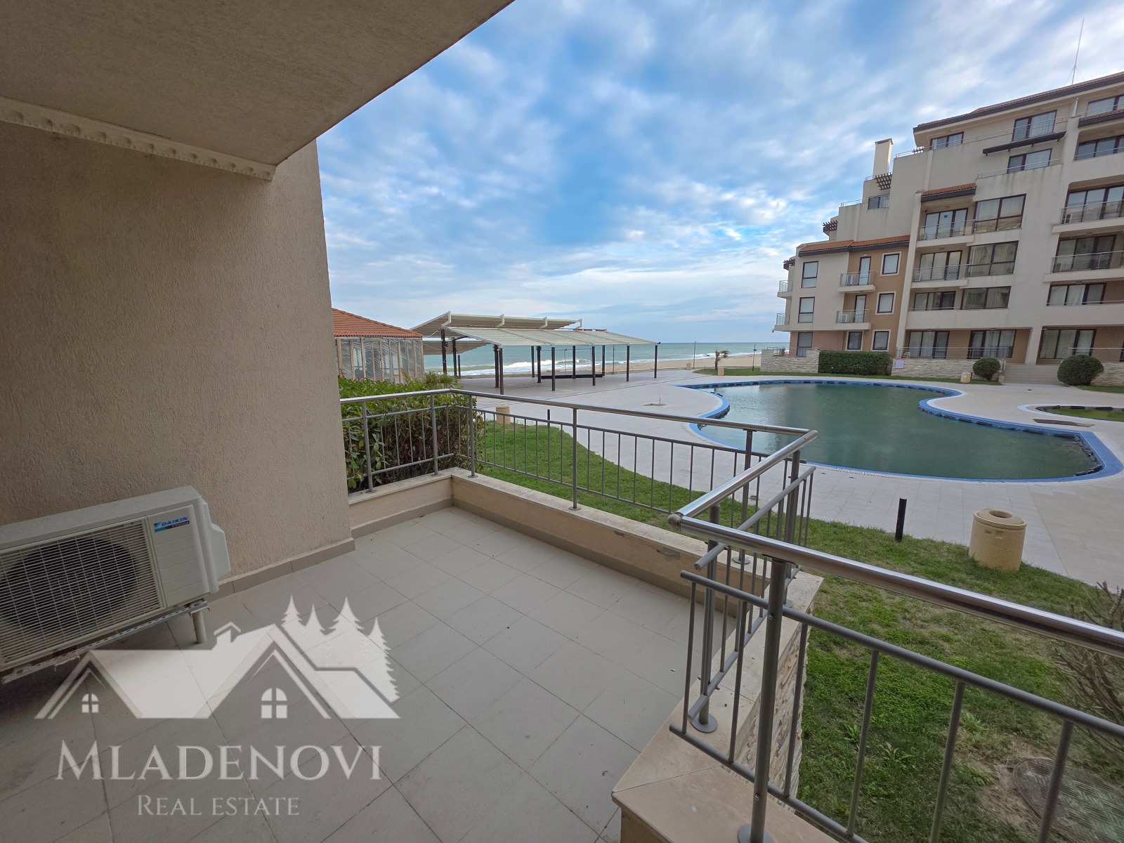Търсите ли си двустаен апартамент с МОРСКА ГЛЕДКА и до плажа? Това е вашето решение! Предлагаме за продажба двустаен апартамент в комплекс от затворен тип, на първа линия море. Комплексът предоставя чудесни условия за пълноценна почивка - басейни, в това число и детски, спа център, фитнес, ресторант с открита тераса, паркинг, детска площадка, супермаркет и др. Въздухът и морската вода са изключително чисти. Жилището се намира на висок партерен етаж и се състои от всекидневна с кухненски кът, самостоятелна спалня, голяма тераса обща за двете стаи, от която се открива чудесна гледка към морето и към басейна, също така може да се използва и за достъп както за влизане, така и за излизане, широко предверие и баня с тоалетна. Имотът се продава с наличното обзавеждане и оборудване. Жилището е изключително светло и слънчево, с югоизточно изложение. Такса поддръжка - в размер 1234 евро/годишно.