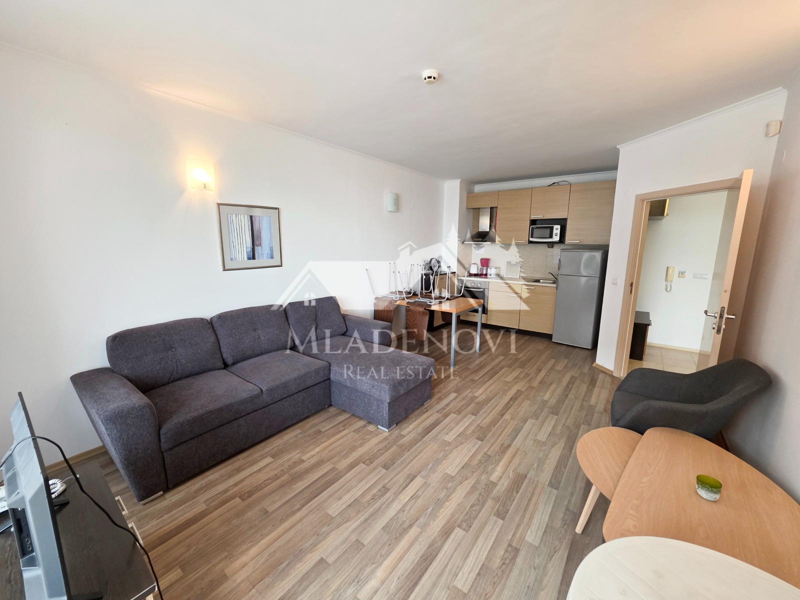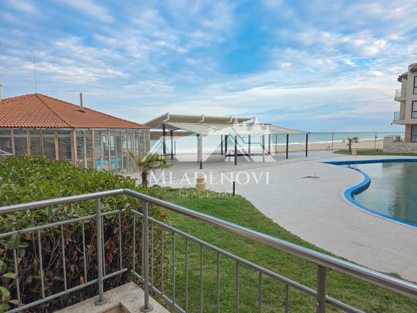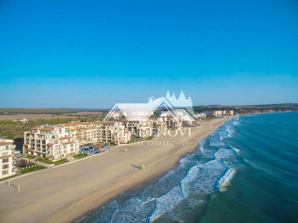 Търсите ли си двустаен апартамент с МОРСКА ГЛЕДКА и до плажа? Това е вашето решение! Предлагаме за продажба двустаен апартамент в комплекс от затворен тип, на първа линия море. Комплексът предоставя чудесни условия за пълноценна почивка - басейни, в това число и детски, спа център, фитнес, ресторант с открита тераса, паркинг, детска площадка, супермаркет и др. Въздухът и морската вода са изключително чисти. Жилището се намира на висок партерен етаж и се състои от всекидневна с кухненски кът, самостоятелна спалня, голяма тераса обща за двете стаи, от която се открива чудесна гледка към морето и към басейна, също така може да се използва и за достъп както за влизане, така и за излизане, широко предверие и баня с тоалетна. Имотът се продава с наличното обзавеждане и оборудване. Жилището е изключително светло и слънчево, с югоизточно изложение. Такса поддръжка - в размер 1234 евро/годишно.
