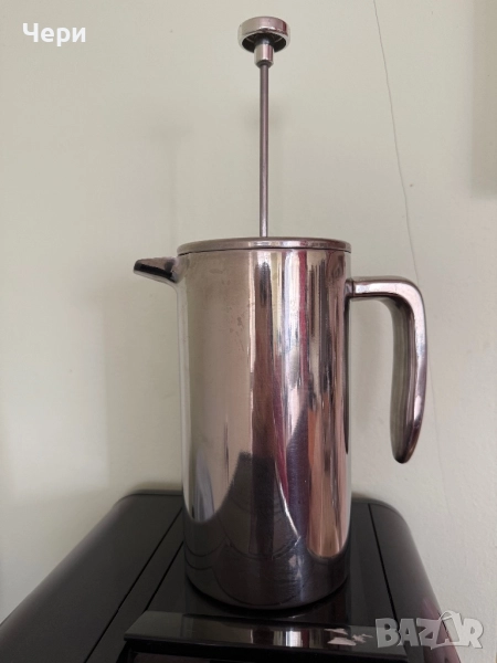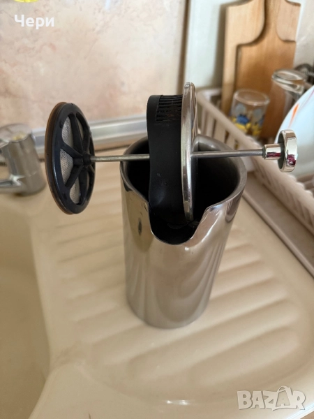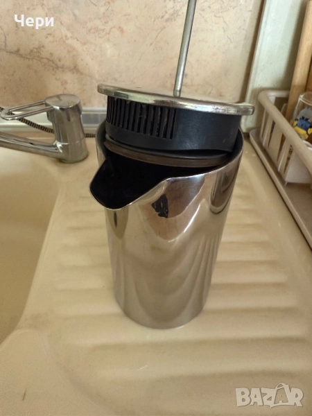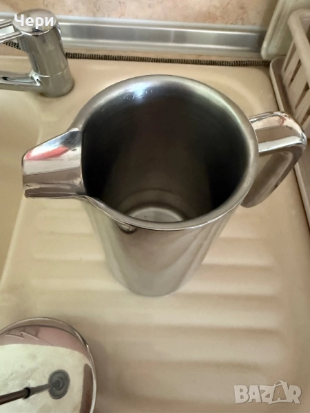 Стилна кана за ръчно разпенване на мляко от неръждаема стомана на марката ТСМ. Почти неизползвана, без забележки.