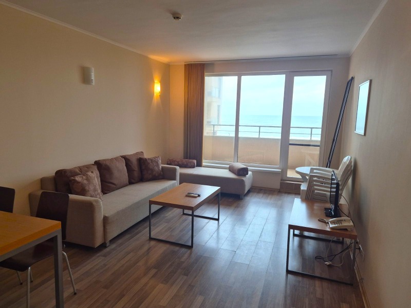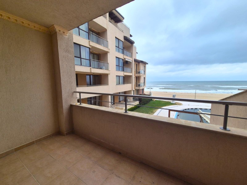 първа линия море. Комплексът предоставя чудесни условия за пълноценна почивка - басейни, в това число и детски, спа център, фитнес, ресторант с открита тераса, паркинг, детска площадка, супермаркет и др. Въздухът и морската вода са изключително чисти. Жилището се намира на първи етаж над висок партер и се състои от всекидневна с кухненски кът, самостоятелна спалня, голяма тераса обща за двете стаи, от която се открива неповторима морска гледка, широко предверие и баня с тоалетна. Имотът се продава с наличното обзавеждане и оборудване. Жилището е изключително светло и слънчево, с югоизточно изложение. Такса поддръжка - в размер 1300 евро/годишно.