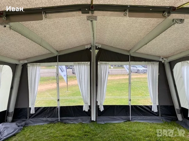 Четирисезонна материя на страниците. Винилов покрив и подсилени калобранни поли. Двупосочни ципове позволяващи отваряне на всички страници както отгоре-надолу, така и странично. Може да се обособява врата, както отпред така и от двете страни. И четирите страници могат да бъдат частично отворени или премахнати напълно. Могат да се навиват надолу като образуват веранда. С комарник. С пълен комплект пердета. С ръчна помпа за надуване. С пола против течение под караваната. С елиминатор на гумата. С комплект за приковаване.