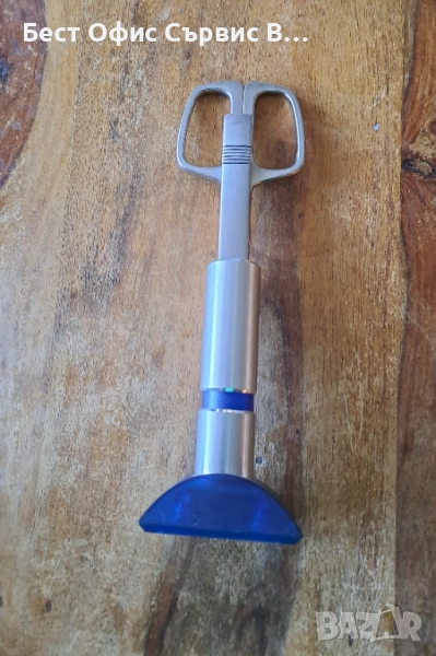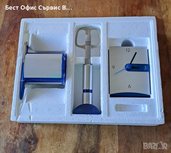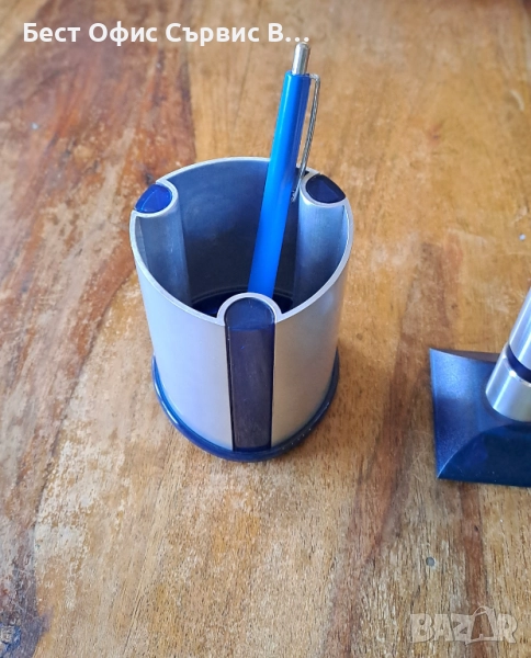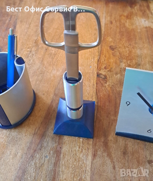 Продавам нож за отваряне на писма моливник часовник и химикалка комплект Хенкелс Германия Aachen Design Germany. Произведено в Германия. Химикалката е синя с металeн клип и пълнител. Моливникът е метален със сини пластмасови части. Размерът на моливника е с височина 9 см и диаметър 7,5 см.