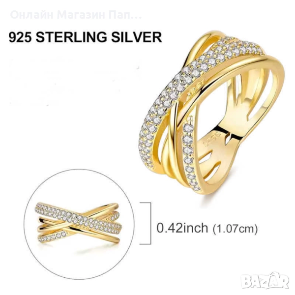 Неговият стилен дизайн с кръстосани халки символизира връзката и хармонията между двама души. Двете по-широки ленти, изцяло обсипани с фино изработени циркони, създават ослепителен ефект и усещане за лукс. Изработен от сертифицирано 925 стерлингово сребро със златисто покритие, този пръстен е съчетание от качество, елегантност и символика.