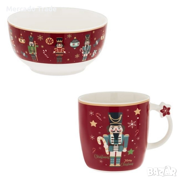 Коледен комплект чаша и купа, в червено с дизайн на лешникотрошачка. Можете да поставите купата върху чашата. Да не се слага в съдомиялна машина и микроволнова фурна.