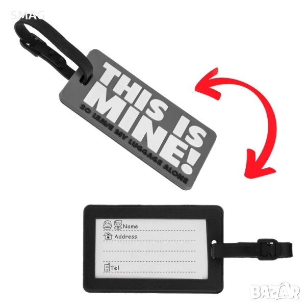Практичен етикет за куфар с надпис „This is Mine!“, който помага лесно да разпознаете багажа си. Оборудван е с примка за стабилно закрепване и карта за попълване на лични данни на гърба. Идеален аксесоар за пътуване със стил и увереност.