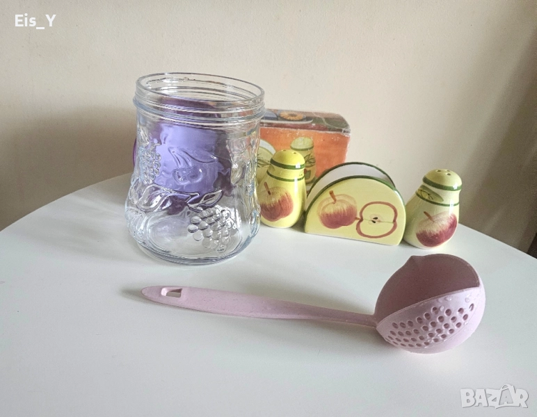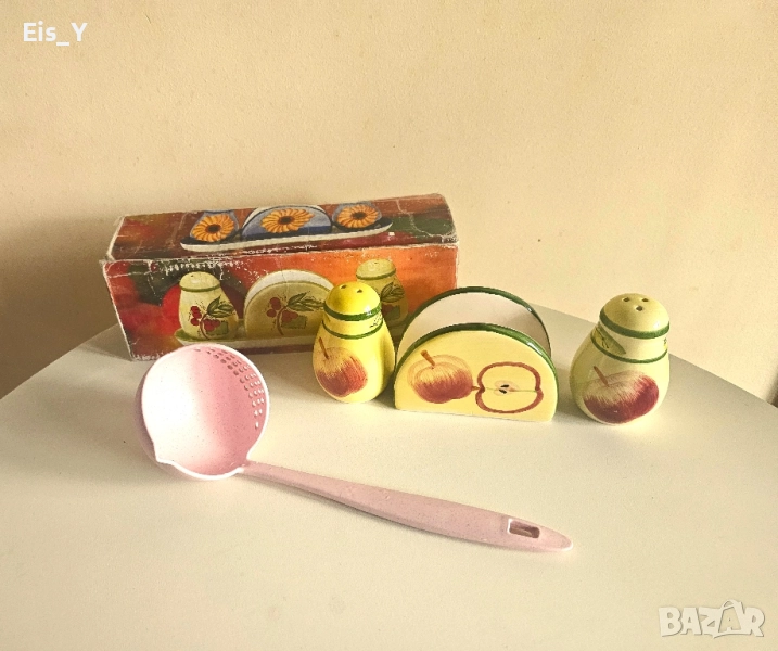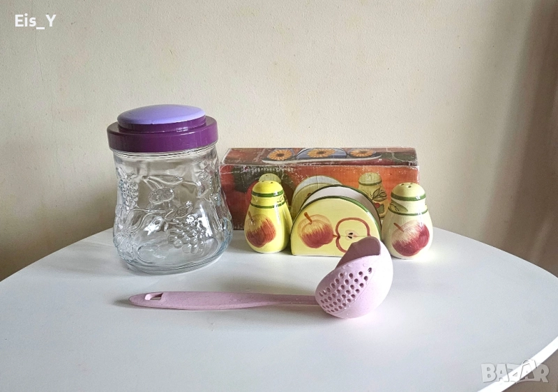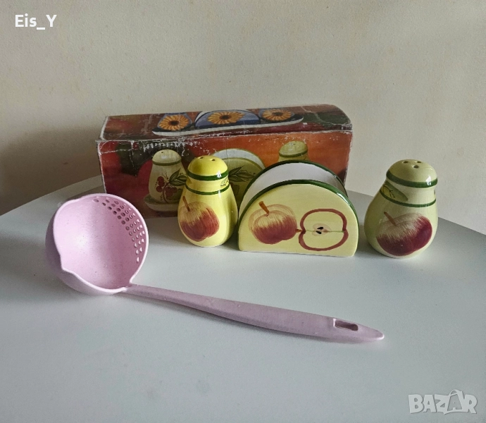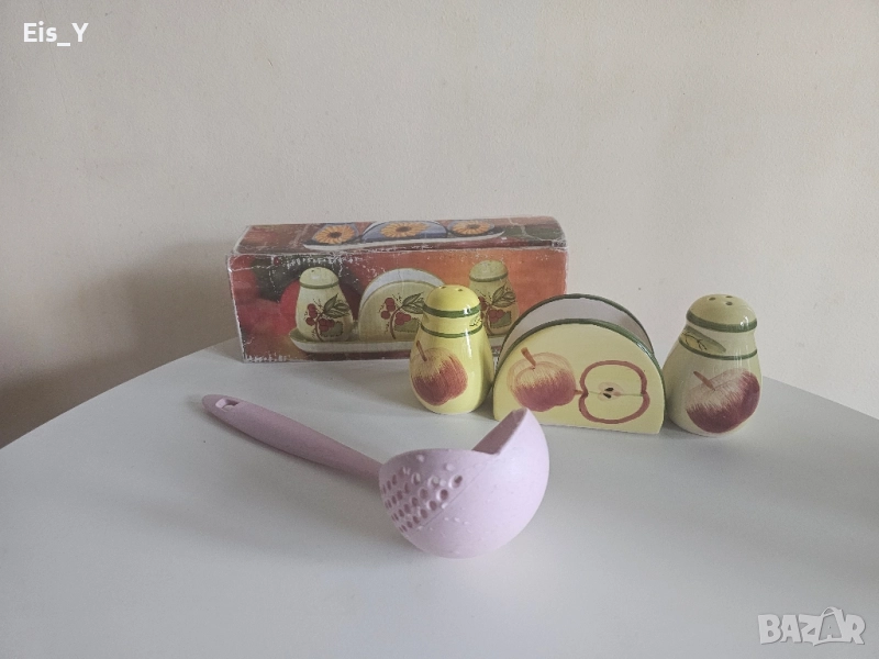 Керамичен комплект солници и салфетник, декоративен буркан и лъжица (отцеждащ черпак) за спагети, 12.50 лв.