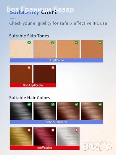 Не е подходящ за светли косми (бели/сиви/червени) и тъмна кожа (тъмнокафява/черна)