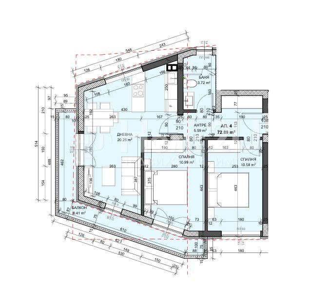 Разпределението на апартаментът е следното:Коридор, спалня, втора спалня с излаз на тераса, всекидневна с излаз на същата тераса, баня с тоалетна.