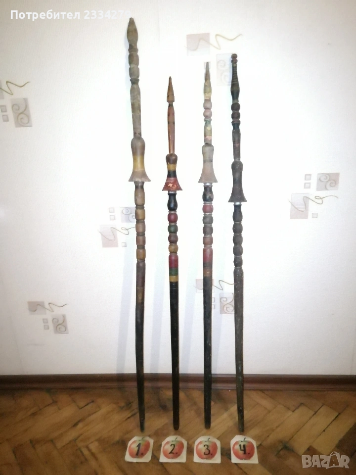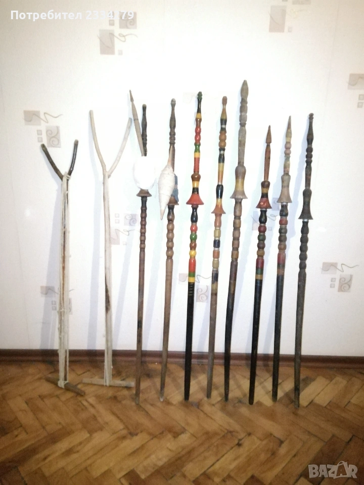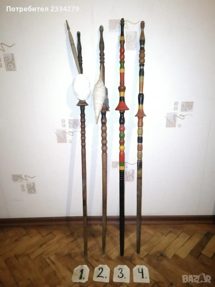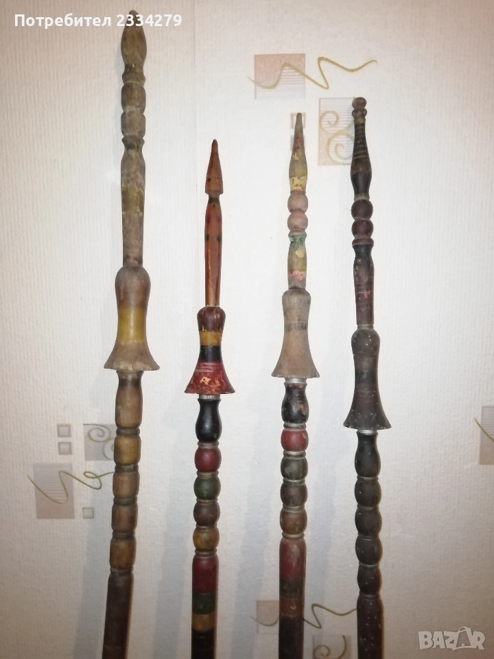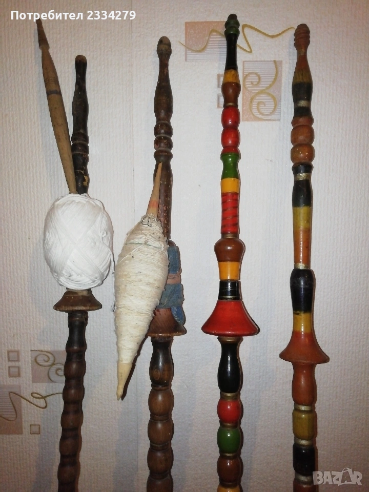 уред за навиване усукване на вълна прежди, размери 48х48см., цена 23€.; N:5 стари ръчно изработени и рисувани хурки от различни години и различни майстори, 100%автентичност, номерация от едно до четири цени 20€. за брой, от едно до четири номер с ябълка цена за брой 15€.; N:6 ръчно изработени 100% автентични вретена различни модели и майстори, цена за бройка 3€., мотовилки 7€. за брой, совалки различни размери 10бр., цена за брой 5€. Всичко е около и повече от 100годишно ръчно изработено от дърво, подходящо за битова къща, механа, витрина и други.