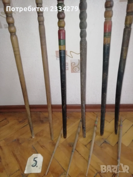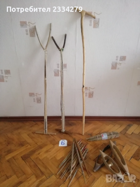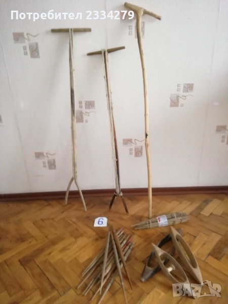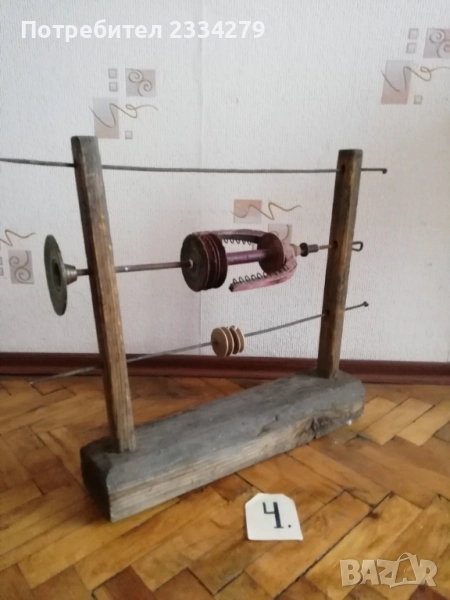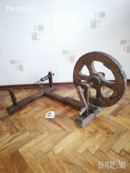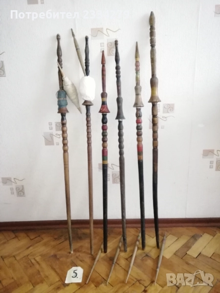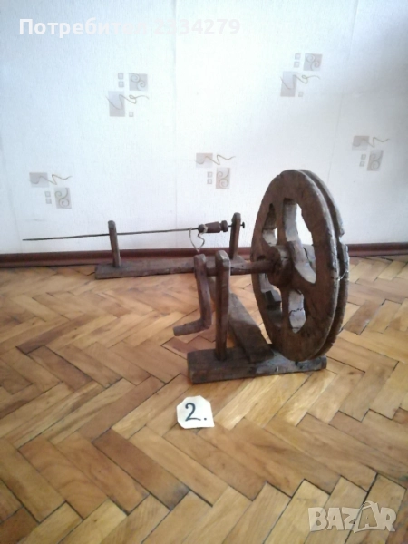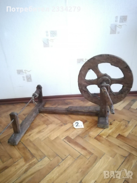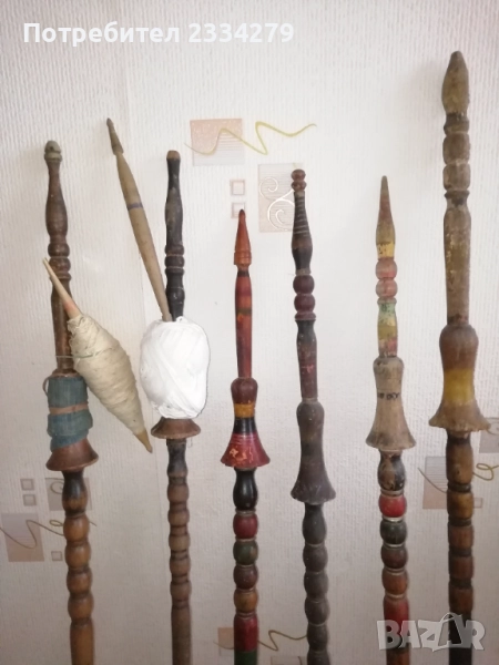 уред за навиване усукване на вълна прежди, размери 48х48см., цена 45лв.; N:5 стари ръчно изработени и рисувани хурки от различни години и различни майстори, 100%автентичност, цени от 25- 45лв. за брой ; N:6 ръчно изработени 100% автентични вретена различни модели и майстори, цена за бройка 5лв., мотовилки 15лв. за брой, совалки различни размери 10бр., цена за брой 7лв. Всичко е около и повече от 100годишно ръчно изработено от дърво, подходящо за битова къща, механа, витрина и други.