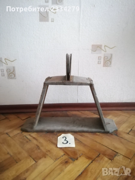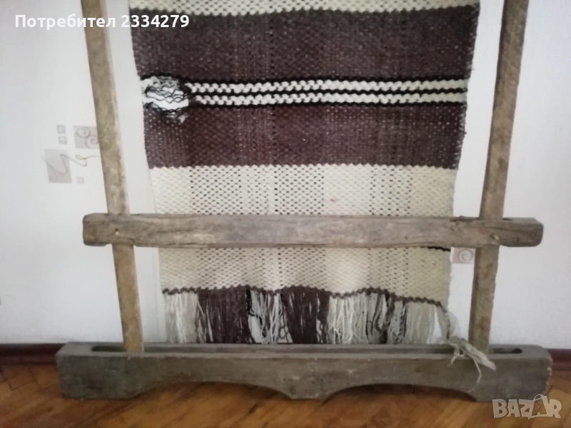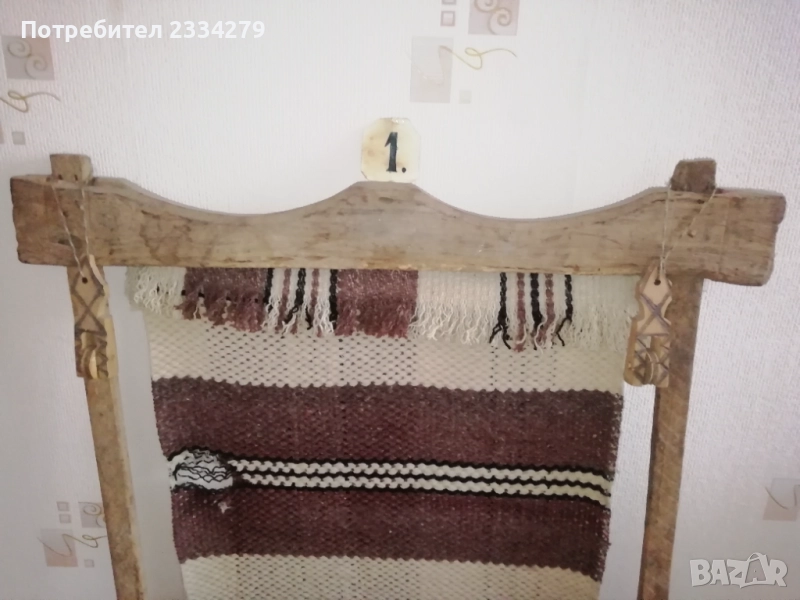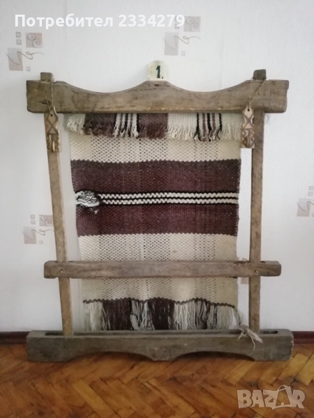 Стари уреди за тъкане и предене на прежди и други. N:1 стари стенен стан (части само за декорация), размери 1м.20см.х 1м.10см., цена 50лв.; N:2 стар дървен чакрък може да се ползва, размери 65х55см., цена 70лв.; N:3 дарак чепкало, ръчно изработено и орнаментирано, поне 100годишно, размери 45х35см., цена 45лв.; N:4 дървен