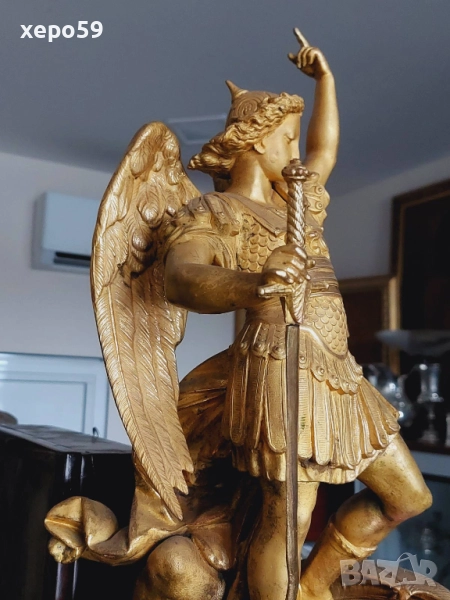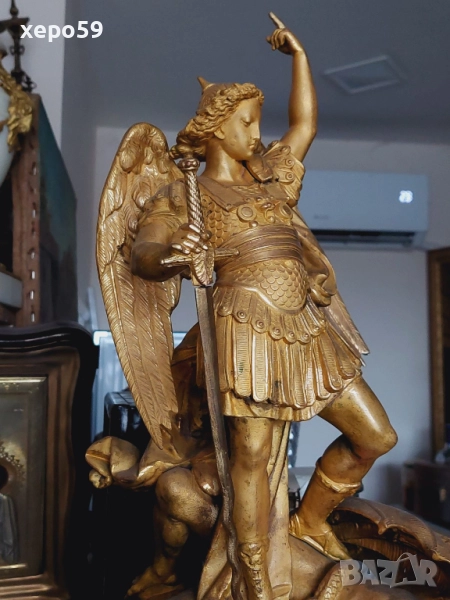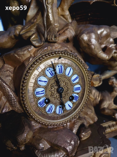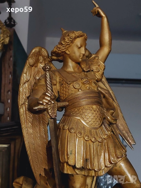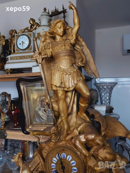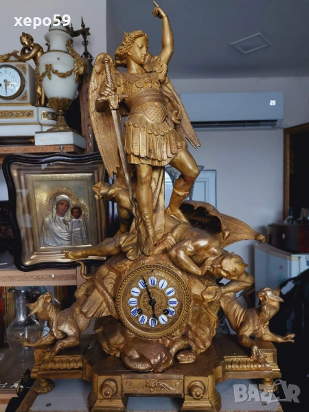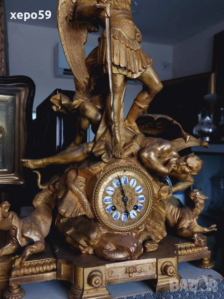 ППредлагам за продажба Рядък и превъзходен скулптурен часовник, произведен около 1870 година изобразяващ Свети Михаил, който убива дявола. Изящно моделиран в бронзово патиниран бял метал, той изобразява Свети Михаил, стоящ триумфално над убития Сатана.Височина 57 см, Ширина 44,5 см, Дълбочина 19 см.Има и подпис на майстора моделирал тази сложна сцена .Предлагам за продажба няколко каминни часовника.Архангел Михаил 2500 евро.Часовникът с люлката е 3000 евро.Часовникът с фигура лъв е 1500 евро плюс две вази.другият който също е с две вази е 1500 евро.Последните два които са с емайлите са по 4500 евро.Имам и доста по евтини,при желание от ваша страна мога да ви изпращам снимки на вайбър.
