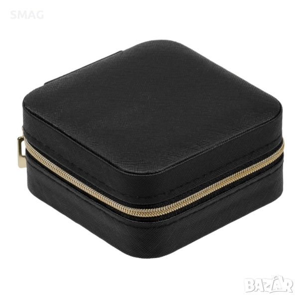 Компактен органайзер за бижута, подходящ за дома или пътуване. Разполага с кадифена подплата, 4 отделения и държачи за пръстени, които поддържат бижутата подредени и защитени от прах и повреди. Черният екстериор и цип осигуряват стил и сигурност при съхранение.
