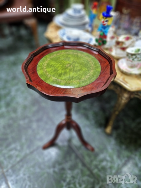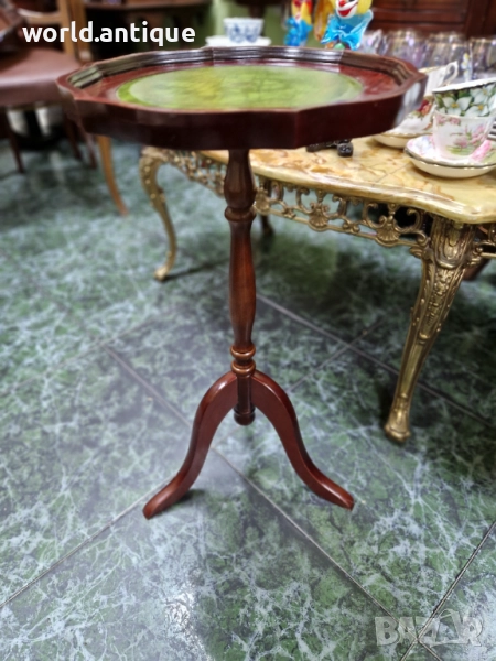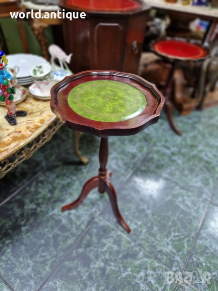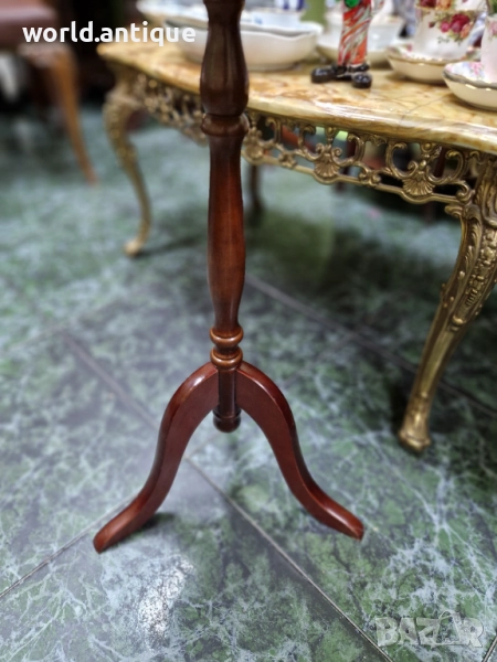 Продавам превъзходна изключително красива антикварна английска дървена помощна масичка в перфектно състояние без никакви забележки. Височина 60 см диаметър 33 см. Работя с всички куриери. Отговарям бързо.