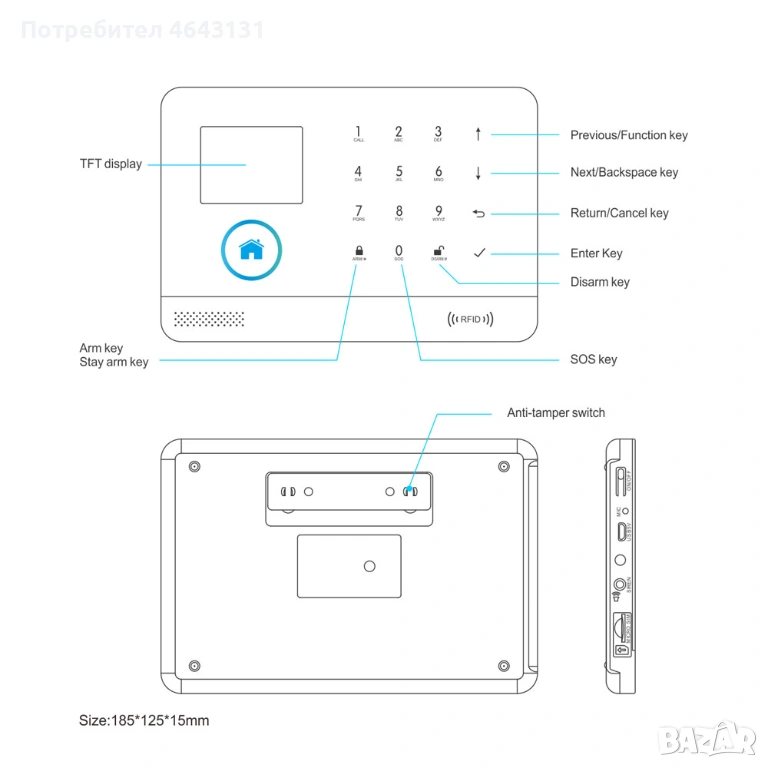 -Обучаване на максимално: 5 броя дистанционни, 5 броя RFID чипове, 90 броя безжични датчика (магнитен, за движение, пожарен, газ, периметър и др.)на 433mhz честота;