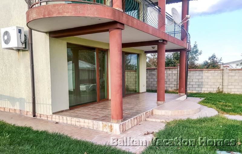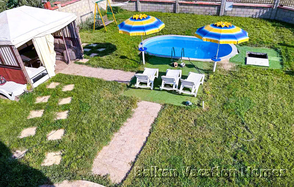 Дворът е озеленен, разполага с автоматична напоителна система, видеонаблюдение, барбекю, джакузи за 6 души, фонтан, паркинг за 3 коли.