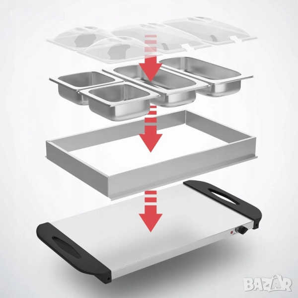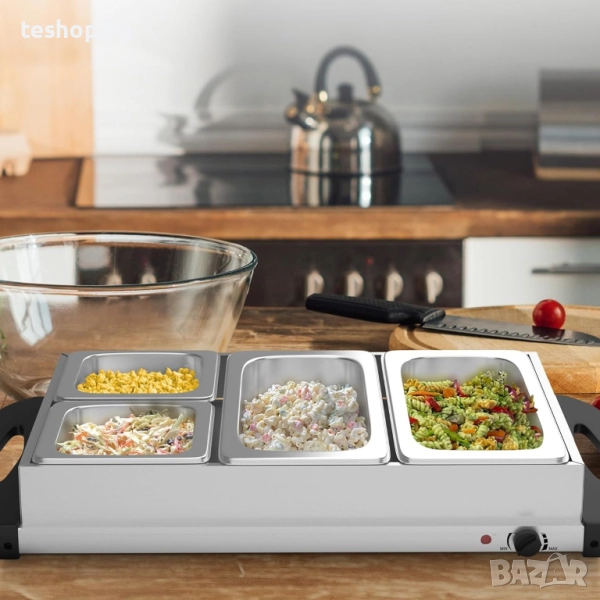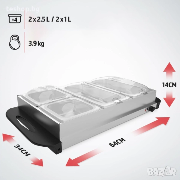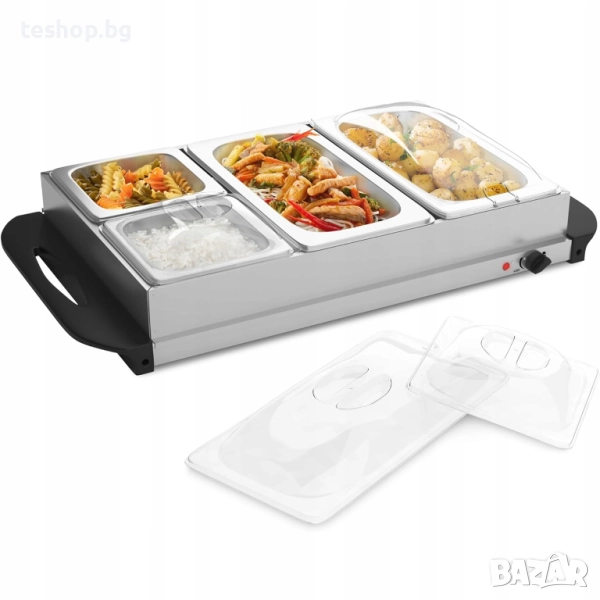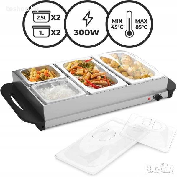 1 x нагревател за бюфет (2 x 2,5 л + 2 x 1 л), основа с крачета, капаци и контейнери включени