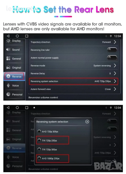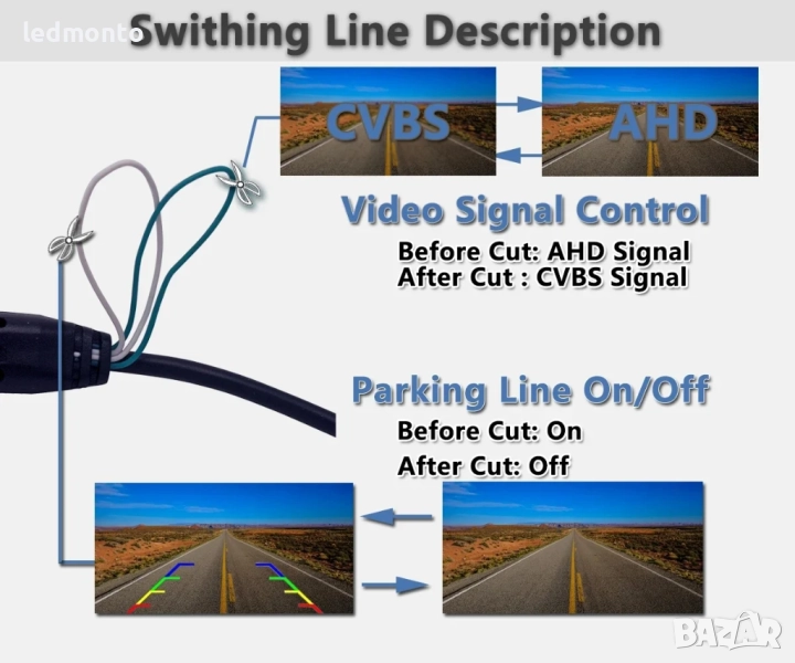 Свалете оригиналната камера, свържете 4-pin конектора, поставете новата камера, проверете изображението. За CVBS – изрежете зеления кабел.