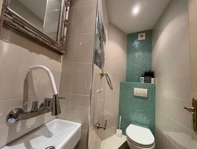 Разпределението включва просторен хол, отделна кухня, две спални, баня с тоалетна, отделна втора тоалетна и три тераси. Апартаментът е обзаведен и разполага с централно отопление (ТЕЦ), което гарантира комфорт през зимните месеци. Месечният наем е 950EUR, отговарящ на високия стандарт на този имот.