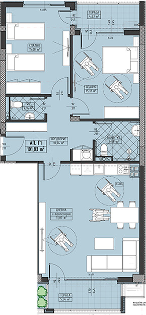 ✅ Жилището се състои от входно антре, хол с кухня, две спални, килер, две тераси, баня с тоалетна, втора тоалетна.