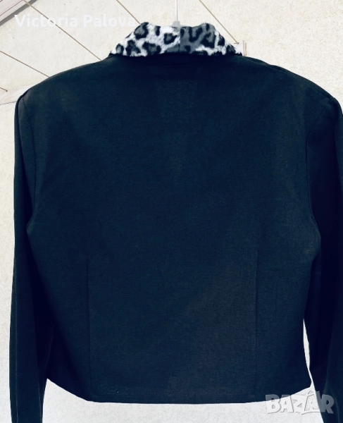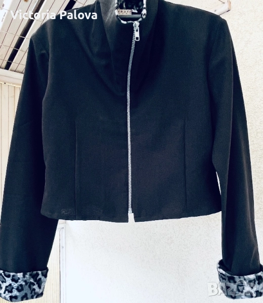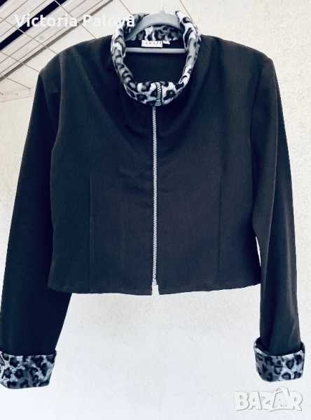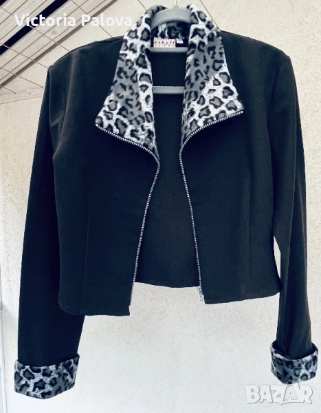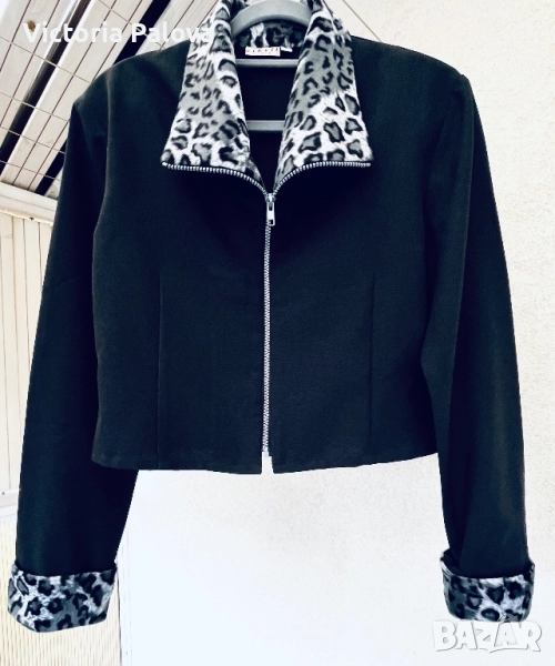 Късо леко яке, находка за любители на винтажния стил с модерен тъч, вдъхновено от духа на 90-те - свобода, бунт и парижки чар от SIBYLL. Леопардовите акценти добавят елегантност и пикантност, без да прекаляват. Не се мачка, лесно се поддържа ( машинно пране) и изглежда винаги като ново. Голяма вариативност на яката : ципът до горе - с бели дънки и тениска - уличен шик; цип, отворен на половина - елегантен вариант с права пола; отворен напълно - с рокля - вечерен вариант. Рамо - ( с леки подплънки) - 46см, ГО - 51см, дължина - 50см, ръкав - 61см.