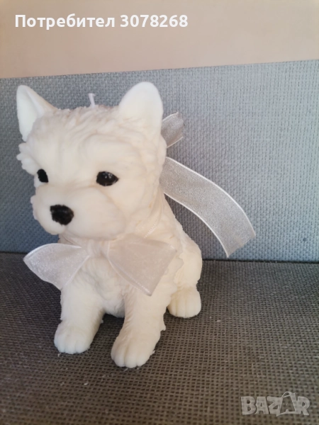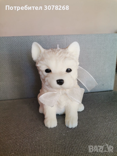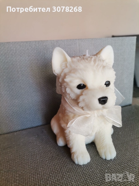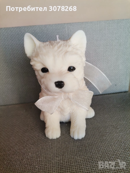 Красива декоративна восъчена свещ в формата на бяло кученце с панделка. Идеалена за украса на дома или подарък за любителите на домашни любимци.