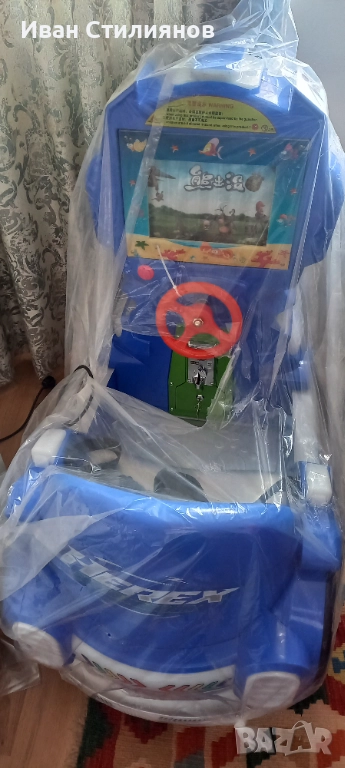 Продава се нова детска клатушка с монетен механизъм и вграден монитор-симулатор. Моделът е с атрактивен дизайн на класическа състезателна кола с LED осветление и анимационен екран, който забавлява децата по време на игра.