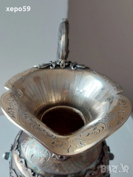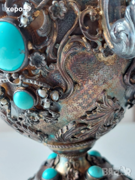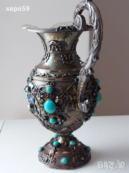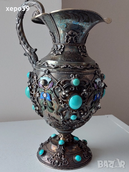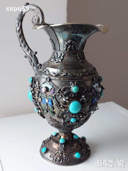 Предлагам тази изключително красива антикварна сребърна кана за вода или вино.Перфектна авторска ювелирна работа.Поставени тюркуазени камъни и емайл.Сребро проба 925.Произведена през 19 век.