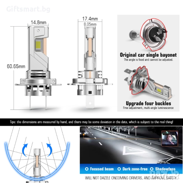 Благодарение на прецизното позициониране на диодите, крушките поддържат 100% точно фокусно разстояние, като перфектно съответстват на оригиналния модел на халогенния лъч, осигурявайки оптимално и фабрично предвидено разпределение на светлината.