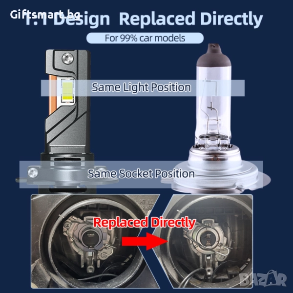 Компактен дизайн: С размер 1:1 фабричните халогенни крушки, комплектът е съвместим с 99% от фаровете, без да пречи на задния капак.