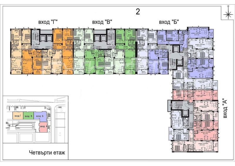 Сграда 2 се състои от 4 входа, разпределени така, че да осигурят удобство и функционалност за живущите. Подземното ниво предлага гаражи и паркоместа, а в зоната около сградата са разположени допълнителни външни паркоместа и зелени площи за отдих. Контрастът между топли и неутрални тонове създава естетически баланс, а широките балкони и големите прозорци осигуряват максимална светлина във всеки апартамент.