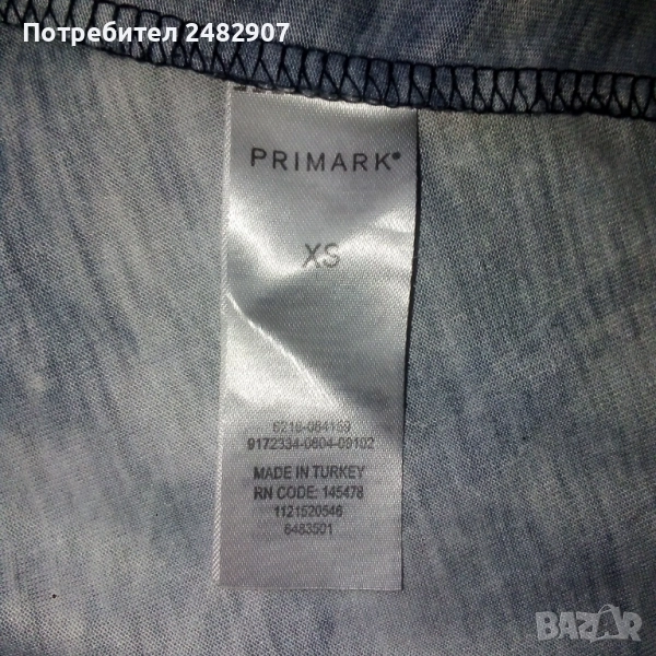 Мъжка тениска Primarк, размер XS. Ширина в раменете - 43 см, ширина под мишниците - 47 см, ширина в долната част - 47,5 см, дължина от рамото до долу - 71 см (отпред) и 77 см (отзад), дължина на ръкава от рамото - 16 см, ширина на ръкава в долната част - 17 см. Много запазена, почти не е използвана, тънка, полупрозрачна.