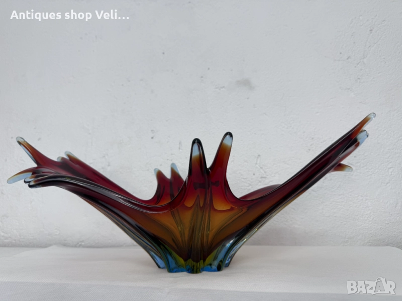 Прекрасна ръчно изработена италианска стъклена купа от многоцветно духано стъкло. Добро състояние. Предлагаме доставка с Еконт и лично предаване за градовете Велико Търново, Русе и Сливен! Размери-53/26/23см.