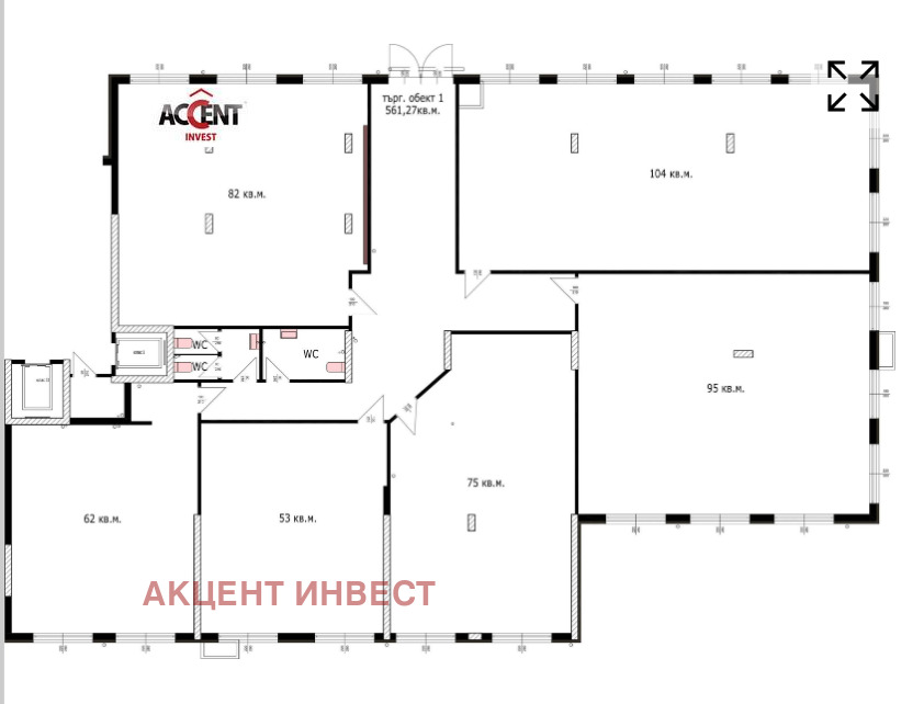 Помещението е на партерно ниво с площ 631,57кв.м.