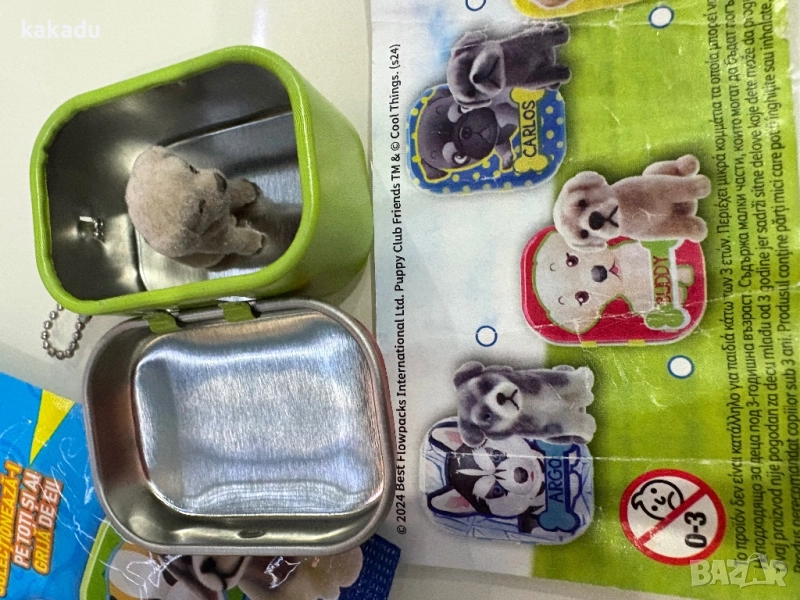 Предлагам колекция от кученца в метална кутийка - 3 лв/бр. Кутийката може да бъде ползвана като аксесоар за окачване на чанта или раница. Във всяка кутийка има малко кученце с лек плюш. Размер на кутийката: 4х3 см.