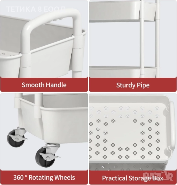 Количката е с четири колела, които се въртят на 360° и позволяват лесно придвижване във всяка посока. Дори когато е натоварена, се мести без усилие — идеална за удобно съхранение.