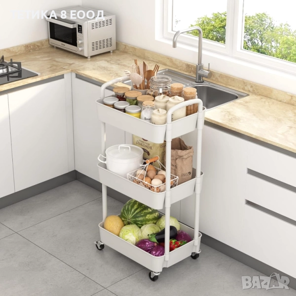 Количка с колела, 3 рафта, 39 x 29 x 76 см, пластмаса/метал, бяла. Три етажна кухненска помощна количка, с дръжка, многофункционална.