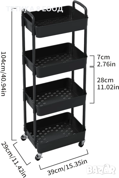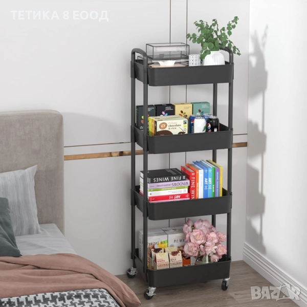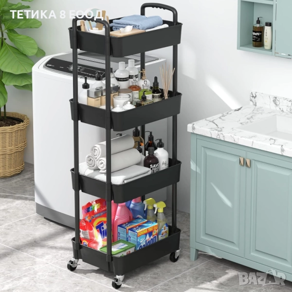 Количка с колела, 4 рафта, 39 x 29 x 104 см, пластмаса/метал, черна. Четири етажна кухненска помощна количка, с дръжка, многофункционална. Мобилен рафт. Количка шкаф органайзер, дренажни рафтове.