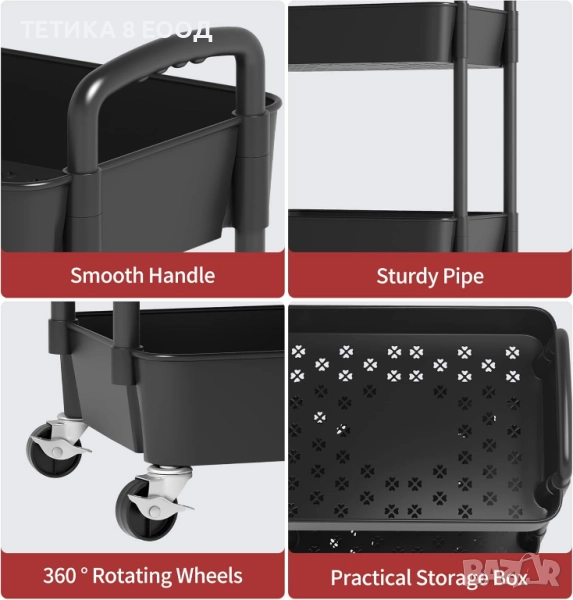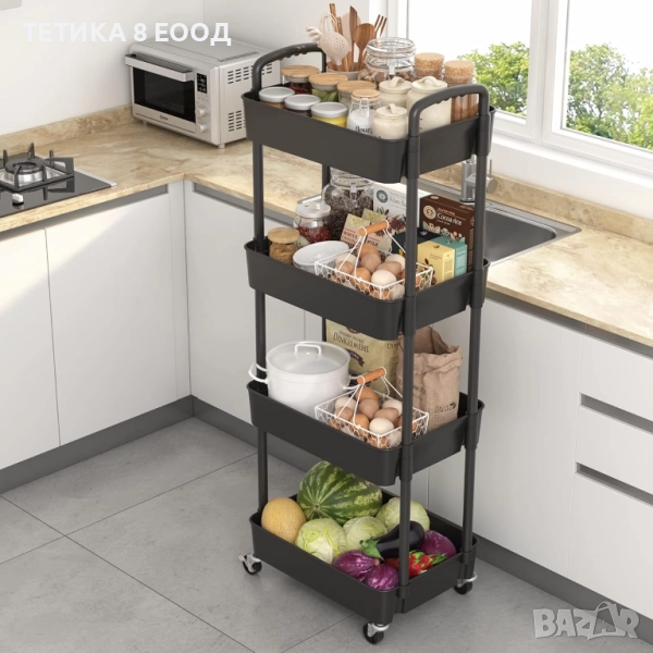 Тази количка с дръжка е подходяща за кухнята, всекидневната, банята, офиса или кабинета. Може да се използва за съхранение на подправки, тоалетни принадлежности, книги и всякакви ежедневни вещи. Помага за поддържане на ред и чистота у дома.