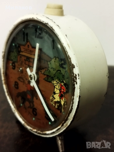 Стар немски механичен анимиран будилник Peter.Работи и звъни.Диаметър-94 милиметра.Анимиран, конникът се клати.Номер на часовника 770048.Забележки-леко пукнато стъкло, и липсват две врътки