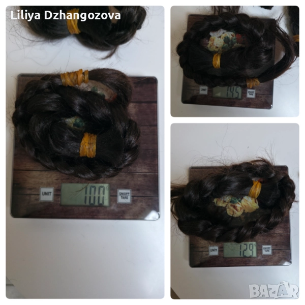 Естествено къдрава коса сплетена на три плитки с общо тегло 374гр.,дължина 58см,в ръзпуснато състояние е около 62см.